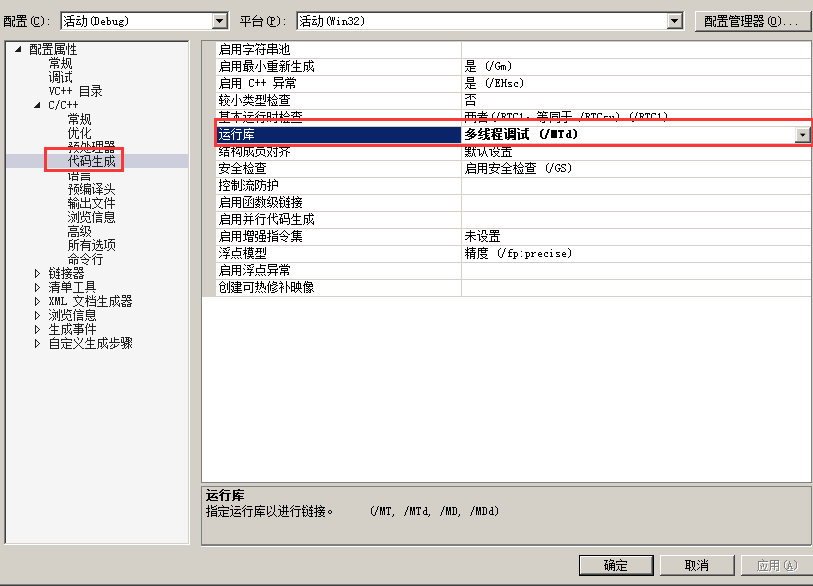 先选择“解决方案管理器”,然后按如下路径:项目-》属性-》C/C++-》代码生成-》运行库,将“多线程调试DLL(/MDd)”改成“多线程(/MT)”或“多线程调试(/MTd)”