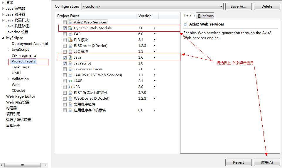 6、在左侧列表中找到Myeclipse->Project Facets,在右侧选择“Dynamic Web Module”和"Java",点击”OK”