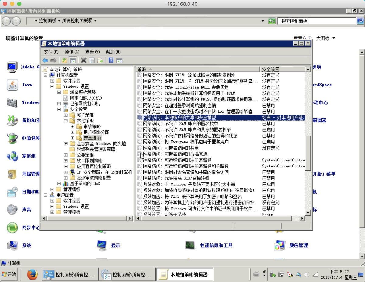 计算机配置==》windows 设置==》安全设置==》本地策略==》安全选项==》网络访问:本地帐户的共享和安全模型