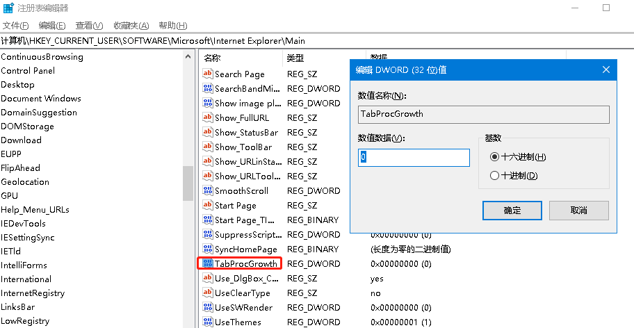 计算机\HKEY_CURRENT_USER\SOFTWARE\Microsoft\Internet Explorer\Main 右侧 右击新建一个字符串值,命名TabProcGrowth,数值数据为0